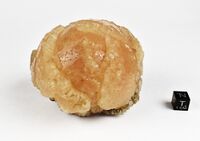Коллекция Систематическая коллекция, №95866. Практически полный сферокристалл стеллерита диаметром около 9 см с оранжево-желтой верхней полусферой и зеленовато-коричневой (вероятно за счет включений селадонита) менее развитой нижней частью. Длина экспоната 9.0 см.Размер минерала 8.00 см.