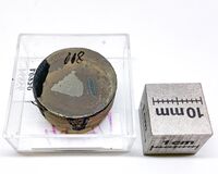 Коллекция Систематическая коллекция, №95894. ГЗерна гармита размером до 100 микрон в кварц-пектолитовом агрегате с эгирином. В эпоксидной запрессовке (диаметр 2см) для микрозондового анализа. Голотип. Размер образца в запрессевке 8х7х2 мм. Длина экспоната 2.0 см.Размер минерала 0.01 см.