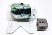 Коллекция Систематическая коллекция, №95909. Полированная пластина кальцифира, содержащего ванадиопаргасит и шпинель. Котип. Размер образца 3х2.5х0.5 см.