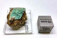 Коллекция Систематическая коллекция, №95910. Открытые радиальные пучки размером до 1 мм ярко-синих игольчатых кристаллов триазолита на зеленоватой кристаллической корочке нашатыря на рыхлой породе. Голотип. Размер образца 2.5х1.5х1.5 см. Длина экспоната 2.5 см.