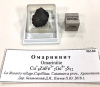 Коллекция Систематическая коллекция, №96160. Черный массивный агрегат размером (1,5 х 1 х 0.3 см) содержащий омаринит, катамаркаит, талкусит, борнит, халькозин сфалерит и теннантит, запресованный в пластик и отполированный. Аналитические данные прилагаются. Длина экспоната 1.5 см.