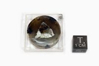 Коллекция Систематическая коллекция, №96270. Зерно бадахшанита-(Y) прямоугольного сечения среди спессартина, кварца, микроклина в эпоксидной шашке диаметром 2.5 см. Голотип. Длина экспоната 2.5 см.