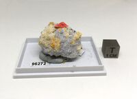 Коллекция Систематическая коллекция, №96272. Агрегаты бежевых кристаллов удинаита с оранжевым гранатом ряда берцелиит-шеферит, ангидритом и гематитом. Голотип. 3 х 2.5 х 2 см. Длина экспоната 3 см.