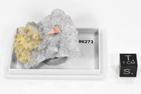 Коллекция Систематическая коллекция, №96273. Агрегаты размером около 2 мм мелких бежевых кристаллов арсенудинаита с берцелиитом, ангидритом и гематитом. 4 х 4 х 2.5 см. Котип. Длина экспоната 4 см.