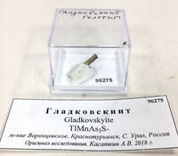 Коллекция Систематическая коллекция, №96275. Кристалл гладковскиита размером менее 0.1 мм на капиллярной нити. Голотип. Длина экспоната 0.1 см.