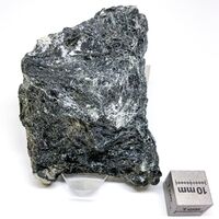 Коллекция Систематическая коллекция, №96321. Массивный агрегат длиннопризматических до игольчатых тёмно-зелёных до чёрного кристаллов ферричермакита и их радиальных сростков. С редким кварцем и мелкими зёрнами апатита и титанита. Размер образца 6 х 4 х 4 см. Длина экспоната 6 см.