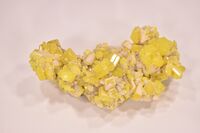 Коллекция Систематическая коллекция, №96613. Изящная друза таблитчатых кристаллов {001}+{111}+{011} серы размером до 2 см на кальците. На кристаллы серы нарастают корочки и сталактитоподобные образования более позднего кальцита. Размер образца 16 х 10 х 6 см. Длина экспоната 16 см.Размер минерала 2 см.