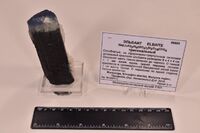 Коллекция Систематическая коллекция, №96665. Столбчатый, со сферически-треугольным сечением зональный кристалл эльбаита размером 9 х 4 х 4 см. Основная часть темно-зеленая до черного. С тонкой ~ 1 мм зоной вдоль граней пирамид головки кристалла и промежуточной бесцветной зоной около 1 см вдоль призм. С наросшим по одной стороне белым альбитом. Длина экспоната 9 см.Размер минерала 9 см.