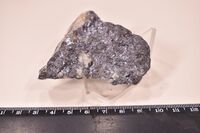 Коллекция Систематическая коллекция, №96670. Серый массивный агрегат сандженароита, фердоусита и баумстаркита с красным пираргиритом в кварце. Размер образца 7 х 5 х 2 см. Длина экспоната 7 см.