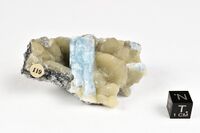 Коллекция Систематическая коллекция, №96709. Голубой уплощенно-вытянутый кристалл ковдорскита размером 4 х 1.5 х 0.4 см на серовато-желтоватой корке коллинсита толщиной около 3 мм на пятнистом сером крупнозернистом доломите с кальцитом (мелкие бесцветные параллельно ориентированные острые ромбоэдры) и пиритом. 7 х 4.5 х 2.5 см. Длина экспоната 7 см.