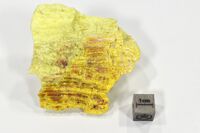 Коллекция Систематическая коллекция, №96914. Частичная псевдоморфоза мелкозернистой желтой самородной серы по слабо деформированному пластинчатому кристаллу аурипигмента размером 7 х 6.5 х 2 см. С зёрнами реальгара. Длина экспоната 7 см.