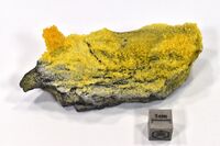 Коллекция Систематическая коллекция, №96932. Щетки и агрегаты прозрачных жёлто-оранжевых кристаллов бромсодержащего нашатыря размером до 0.8 мм на обожжённом углистом сланце. Размер образца 11 х 5 х 4 см. Длина экспоната 11 см.
