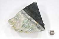 Коллекция Систематическая коллекция, №97065. Прожилок мощностью 7 см, сложенный прозрачным светло-зелёным листоватым тальком и белым доломитом, на тёмно-зелёном массивном серпентинизированном перидотитовом коматиите. Размер образца 15.5 х 13 х 7 см. Длина экспоната 15 см.