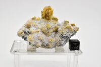 Коллекция Систематическая коллекция, №97146. Бледно-желтые игольчатые кристаллы рабдоборита-(V) и рабдоборита-(W), бледно-фиолетовые игольчатые кристаллы кальциойохиллерита, белые игольчатые кристаллы свабита на почковидных оранжево-жёлтых агрегатах берцелиита на корке белого ангидрита, в основании которой находятся игольчатые черные кристаллы людвигита, изометричные зерна диопсида горчичного цвета и пластинчатые кристаллы темно-серого гематита. Размер образца 7 х 5 х 4 см. Длина экспоната 7 см.