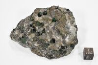 Коллекция Систематическая коллекция, №97153. Темно-зеленые ромбододекаэдрические кристаллы уваровита размером до 7 мм в сером кварце с зернами пирита. Размер образца 8 x 6 x 4 см. В основании подпилен. Длина экспоната 8 см.Размер минерала 0.7 см.