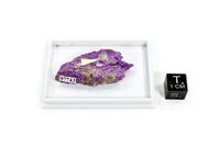 Коллекция Систематическая коллекция, №97743. Светло-зелёный тонкозернистый агрегат (~ 0.6 см) казнахтита (группа гидроталькита), тесно срастающийся с серпентином (лизардит+хризотил) в сиреневом стихтите с серпентином. Длина экспоната 4 см.Размер минерала 0.6 см.
