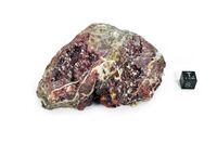 Коллекция Систематическая коллекция, №97748. Корки ромбоэдрических кристаллов киновари (до 5 мм) с кристаллами горного хрусталя (до 3 мм), инкрустирующие полости в серой окварцованной породе. Основание образца спилено. Длина экспоната 8 см.