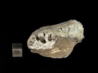 Коллекция Месторождения, №31141. Фосфорит темно-серый, просверленный камнеточцами морского пляжа. 7х5х375 см.