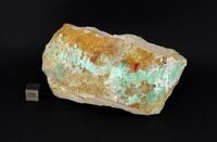 Коллекция Месторождения, №31151. Темно-зеленые ячеистые корочки с голубым айдырлитом - псевдоморфоза по сталактитовой коре кальцита на известняке. 14х7.5х3.5 см.