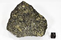 Коллекция Месторождения, №31251. Разноориентированные пластинчатые выделения пирита до 0.3-3 см в мелкозернистом магнетитовом агрегате. 9х8 см. Длина экспоната 11 см.
