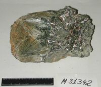 Коллекция Месторождения, №31342. Друза уплощенных пинакоидальных призматических расщепленных в плоскости [010] зеленых кристаллов до 5х12 см. В промежутках между кристаллами и субиндивидами белый тонковолокнистый геденбергит, кроме того, реже, кальцит и ильваит, а поверхности друзы отдельные сферокристаллы геденбергита до 1.6 см с бархатистой поверхностью за счет обрастания тонковолокнистым геденбергитом. 27х17х17 см. Длина экспоната 27 см.