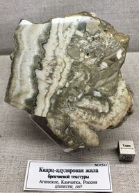Коллекция Месторождения, №31523. 173/м. Кварц-адуляровая жила брекчиевой текстуры с сульфидами и золотом.
