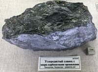 Коллекция Месторождения, №31543. 1071/м. Углистые сланцы, насыщенные тонкоигольчатым арсенопиритом, с прослоями и линзочками пирита и секущими их тонкими кварц-карбонатными прожилками.