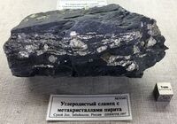 Коллекция Месторождения, №31545. 535/м. Углеродистые сланцы с гнезадми и вкрапленностью крупнозернистого пирита.