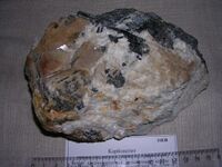 Коллекция Месторождения, №31838. Белый крупнозернистый кальцитовый агрегат с агрегатом и кристаллами микроклина до 3.5см и темно-зеленым эгирин-авгитом с вкрапленностью коричневого пирохлора. Длина экспоната 15 см.