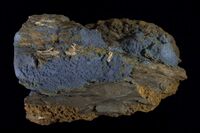 Коллекция Месторождения, №31840. Синий землистый агрегат в лигните из табачной руды. Первая генерация вивианита. Длина экспоната 12 см.