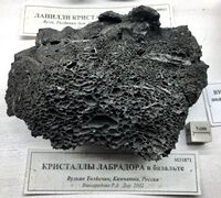 Коллекция Месторождения, №31871. Пористая базальтовая лава темно-серого цвета с вкрапленниками пластинчатых кристаллов лабрадора (максимальный размер кристаллов 2,8 см). Длина экспоната 12 см.