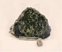 Коллекция Месторождения, №32007. Крупные зерна серо-зеленого энстатита с оливином и пиропом в эклогитовом ксенолите в кимберлите. Полированный образец. Длина экспоната 11 см.