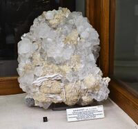 Коллекция Месторождения, №32335. Друза бесцветных прозрачных кубоктаэдрических кристаллов флюорита размером до 4см с кремовыми скелетными ромбоэдрами кальцита и снежно-белыми пластинчатыми кристаллами кальцита. (папиршпата). Длина экспоната 28 см.