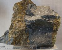 Коллекция Месторождения, №32485. Жила пентландит-пирротин-халькопиритового состава мощностью 8 см в кварцевом диорите Длина экспоната 29 см.