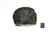 Коллекция Месторождения, №33046. Фрагмент ксенолита гранатового дунита из кимберлита. Среднезернистая порода, состоит из серпентинизированного оливина и Cr-пиропа. Полированная пластина. Длина экспоната 6.5 см.