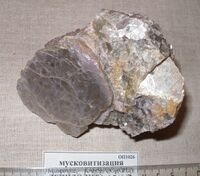 Найден: Завитая, Восточное Забайкалье, Россия.Замещаемый субстрат - мусковит. Расположен на витрине exp11-4