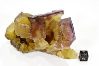 Коллекция Образования и превращения, №1603. Щетка кубических зональных (внешняя зона ~3 мм, фиолетовая, остальное желтого цвета), вытянутых вдоль Lз кристаллов. Боковые поверхности - индукционные поверхности срастания со сферолитами ? растворенного минерала. Разм. 10,5х5,5 см. Длина экспоната 4 см.