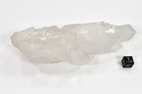 Коллекция Образования и превращения, №1610. Кристалл с косыми по отношению к удлинению псевдогранями и опоясывающими рубцами - следами совместного роста с ныне растворенным пластинчатым кальцитом. Размер 15х4,5 см. Длина экспоната 15 см.