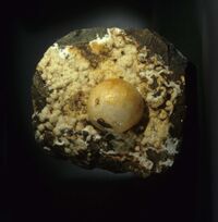 Коллекция Образования и превращения, №1629. Сферокристаллы до 4 см на поверхности газового пузыря в базальте. Разм.17,5х12х5 см. Длина экспоната 18 см.