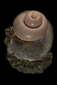Коллекция Образования и превращения, №1721. Псевдоморфоза родохрозита по изначально кальцитовой спиральной раковине моллюска. Длина экспоната 4 см.