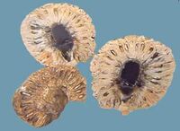 Коллекция Образования и превращения, №1725. Замещенные халцедоном шишки араукарии (Araucaria petrified cones) юрского периода. Две отполированные половинки одной шишки и фрагмент (со сколом) другой шишки. Длина экспоната 6 см.
