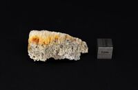 Коллекция Образования и превращения, №1822. Фрагмент грифона - корка параллельношестоватых кристаллов, подкрашенных в оранжевый цвет кремерзитом ? Длина экспоната 5 см.