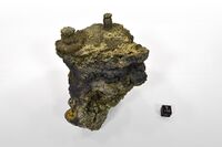 Коллекция Образования и превращения, №1868. Заберег (частично обрастающий и 2 псевдосталактита) с четко выраженными 8 уровнями раствора, сложенный ритмически повторяющимися шестоватыми слоями пирита и марказита. Пленки галенита на марказите, землистый сфалерит. Длина экспоната 11 см.