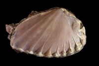 Коллекция Образования и превращения, №1902. Розовый тонкозернистый агрегат родохрозита замещает внутреннюю часть створки моллюска. Раковина моллюска в оолитовой железной руде. Длина экспоната 8 см.