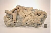 Коллекция Образования и превращения, №1938. Псевдоморфоза светлых кремовых сферолитовых корок доломита по призматическим до 5х2см кристаллам арагонита. Длина экспоната 20 см.Размер минерала 5 см.