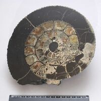 Коллекция Образования и превращения, №1976. Hа полированном срезе раковины аммонита замещенные пиритом перегородки между камерами, заполненными светлым и темным кальцитом. Размер образца 20х18х3см. Длина экспоната 20 см.