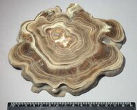 Коллекция Образования и превращения, №1979. Двусторонний поперечный срез кальцитового сталактита с зональностью в коричневых тонах. Полированный образец. 16х1,5см Длина экспоната 16 см.