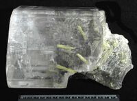 Коллекция Образования и превращения, №2181. Прозрачный бесцветный кристалл гипса призматического габитуса с "фантомом" более раннего серого гипса и включениями "елочек" серы Длина экспоната 20 см.
