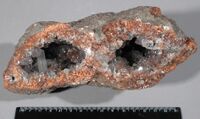 Коллекция Образования и превращения, №2183. Голубоватые прозрачные кристаллы в жеоде на подложке из целестина, окрашенного в красный цвет примесью гематита. Жеода обладает своеобразной, очковой формой. Размер образца 18х9х8см. Длина экспоната 18 см.