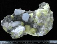 Коллекция Образования и превращения, №2187. Расщепленные кристаллы голубоватого полупрозрачного целестина размером до 1,5х1,5см. с кристаллами серы на друзе серых кристаллов кальцита (до 0,2см). Размер образца 10х6см. Длина экспоната 10 см.